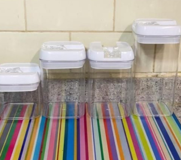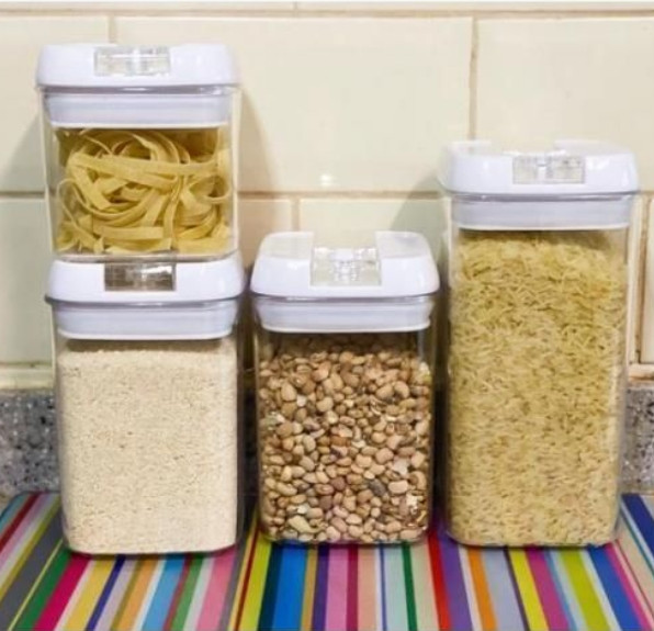 4-piece container set are airtight, stackable and space-efficient, making it easy to keep your dry foods fresh and your kitchen organized. For a true airtight seal just push the button, it also pops up to serve handle for the lid. Designed for modular stacking, These Containers’ are sleekly design to manage space in your kitchen without compromising the safety of your food stored inside.