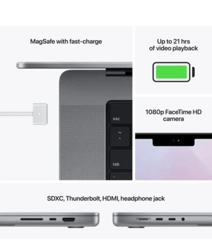 Transfer photos and videos with an SDXC card reader. Connect to TVs or displays with HDMI output. Listen using a 3.5 mm headphone jack that detects and automatically adjusts for high???impedance headphones. Connect to high-speed peripherals or displays with three Thunderbolt 4 ports. And fast???charge using the quick???releasing MagSafe 3 port.
