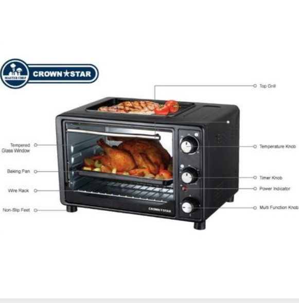 The Crownstar 21l Oven toaster features a 4 durable stainless steel heating element for fine heating, baking, toasting and grilling. The 4 Stages heating selector and 100-250 degrees thermostat control ensure a perfect result. It has a 60 minutes timer with end bell ring to notify you at the end of the cooking process. Designed with anti-heating scalded door-opening design for easy opening of the door.