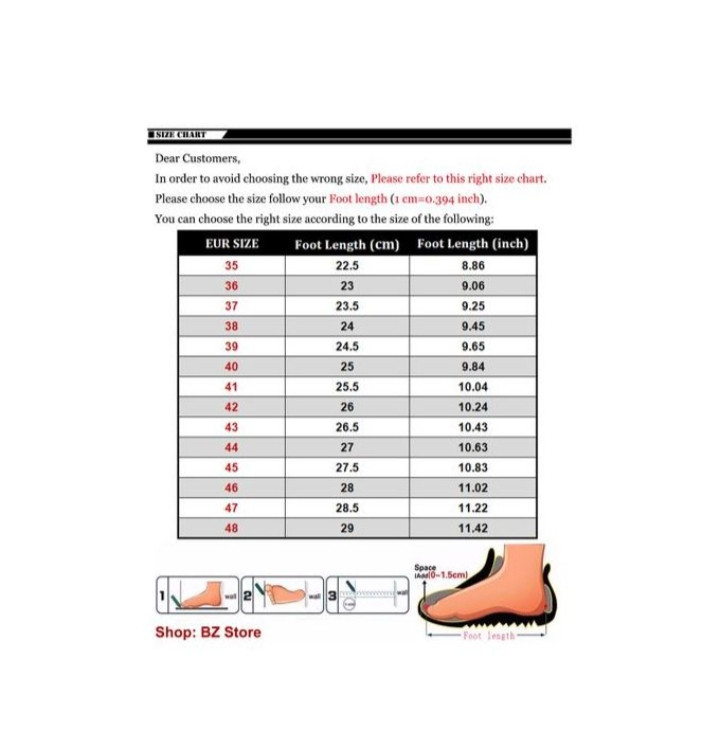Size chart--- Men Size (38-48) ---Women Size(35-42)