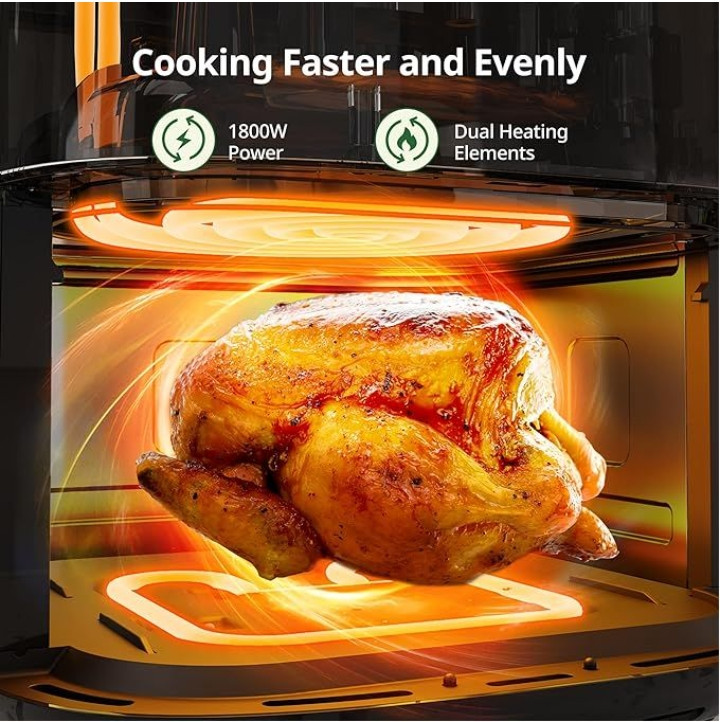 This air fryer with fast air circulation technology will be your new kitchen helper, cooking even fried foods without grease. Bake, roast, grill, fry fish, chicken, meat or potatoes in one go with this quick and easy air baking, roasting and grilling, fryer. Enjoy oil-free baking!